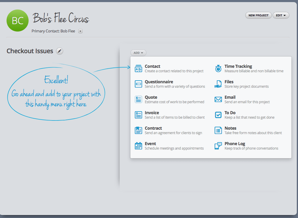 From there you’re prompted to create a new project for the client. In 17hats everything is centered around a project which is fine, but not great, as I’ll talk about later.