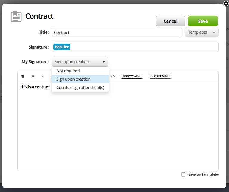 When creating a contract to go with an estimate you have a number of options related to the signature. I always set it up to sign right away since ‘counter-signing’ means the client drops out of the automated workflow through to payment.