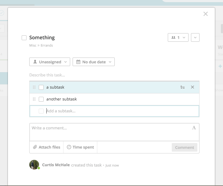 One of my favourite additions to Redbooth has been their sub-tasks. With a main item open you can add sub-items to it. Then if the sub-item really needs its own full task you can simply click a little arrow on the far right of the sub-task and break it out into its own task. This still leaves a link between the two as well so you can easily find items that used to be sub-tasks.