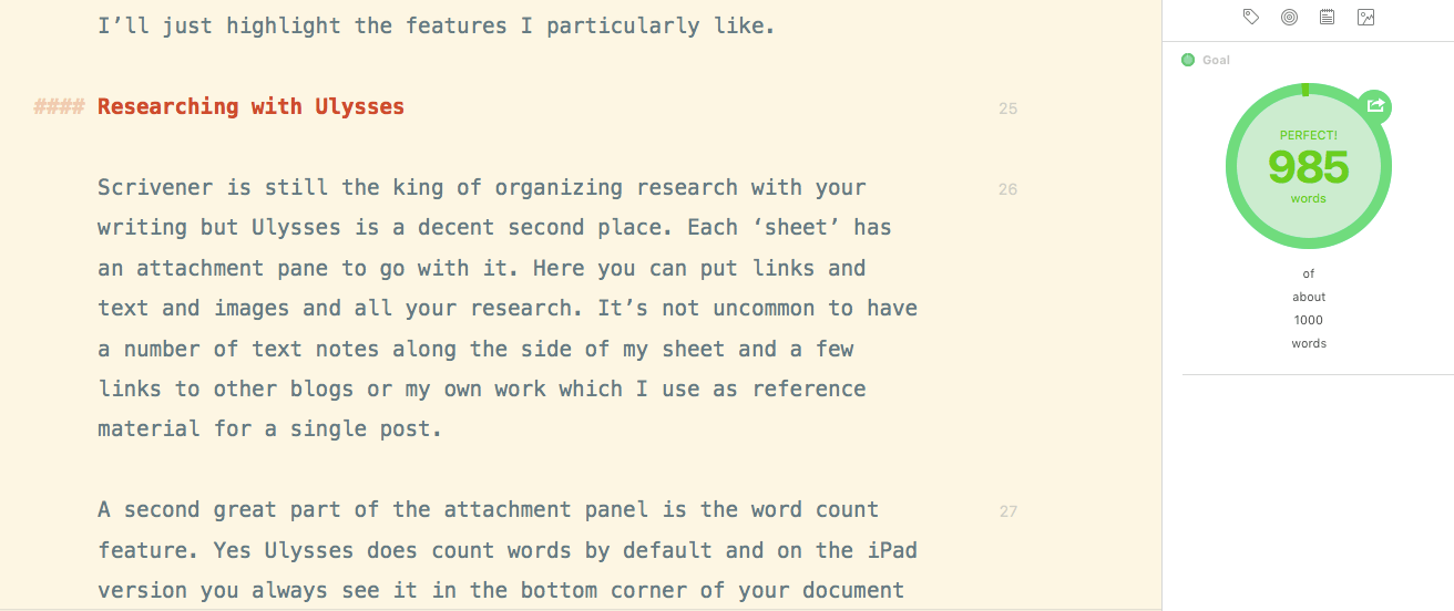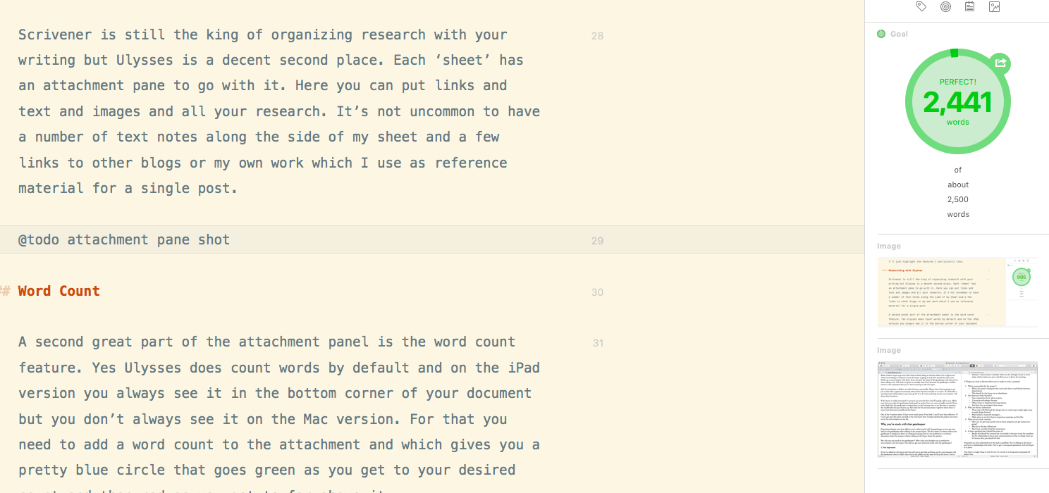 A second great part of the attachment panel is the word count feature. Yes Ulysses does count words by default and on the iPad version you always see it in the bottom corner of your document -- but you don’t always see it on the Mac version. For that you need to add a word count to the attachment, which gives you a pretty blue circle that goes green as you get to your desired count and then red as you get too far above it.