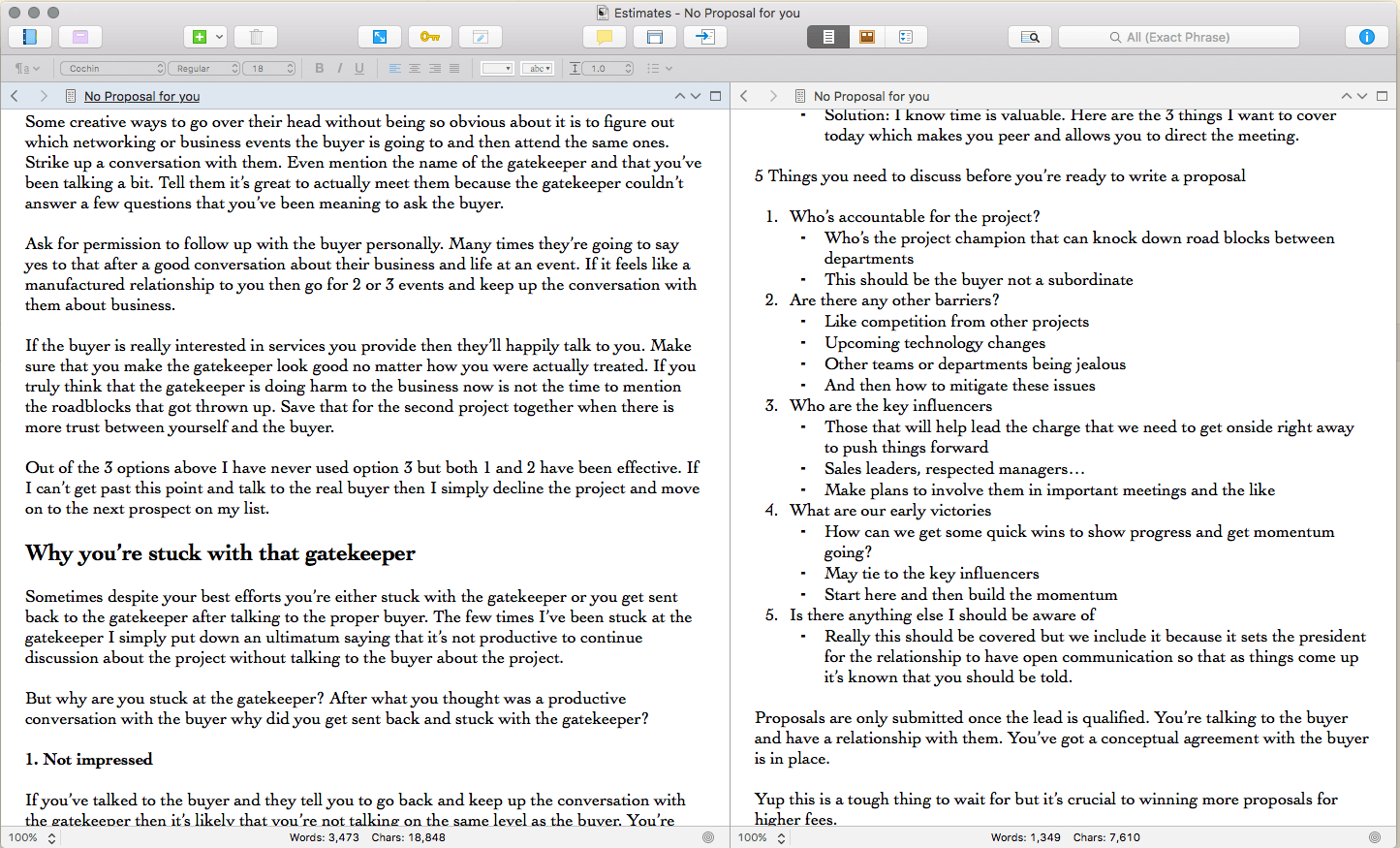 For my most recent book Writing Proposals that Win Work I tried to use Ulysses but it just didn’t work so I was back to Scrivener, which has been my book writing companion forever. The big pain points with Ulysses were the lack of really being able to organize research in a way that made sense, and the lack of a split screen view.