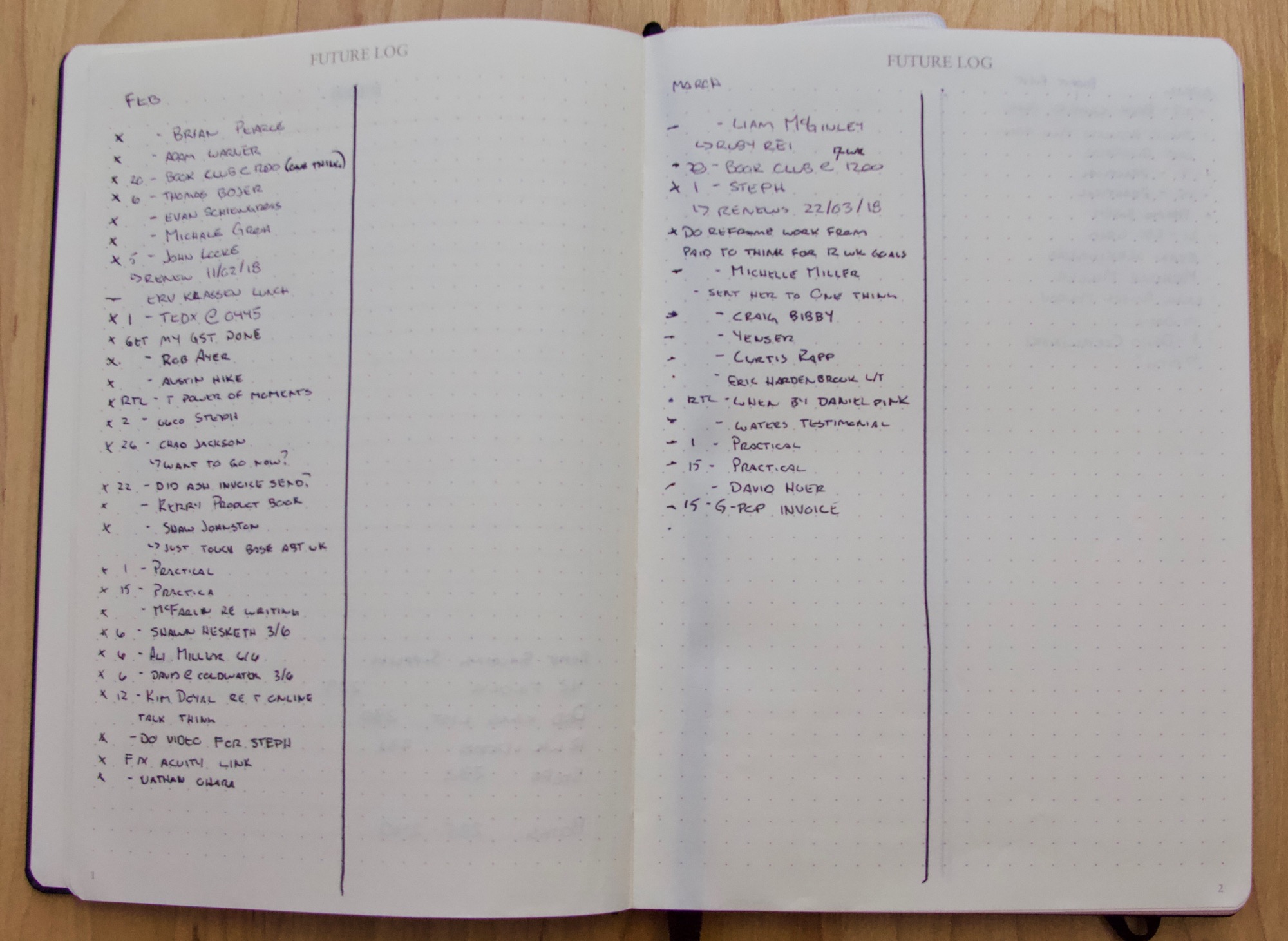 After your Index is the Future Log. This is a listing of the months in the future so you can put tasks down that need to be done at some point that’s not now. I leave one page per month and cover the next 6 months. The final page of my future log is for “Future” which means it’s a collection of any tasks that need to be done after the 6 months I have currently recorded.