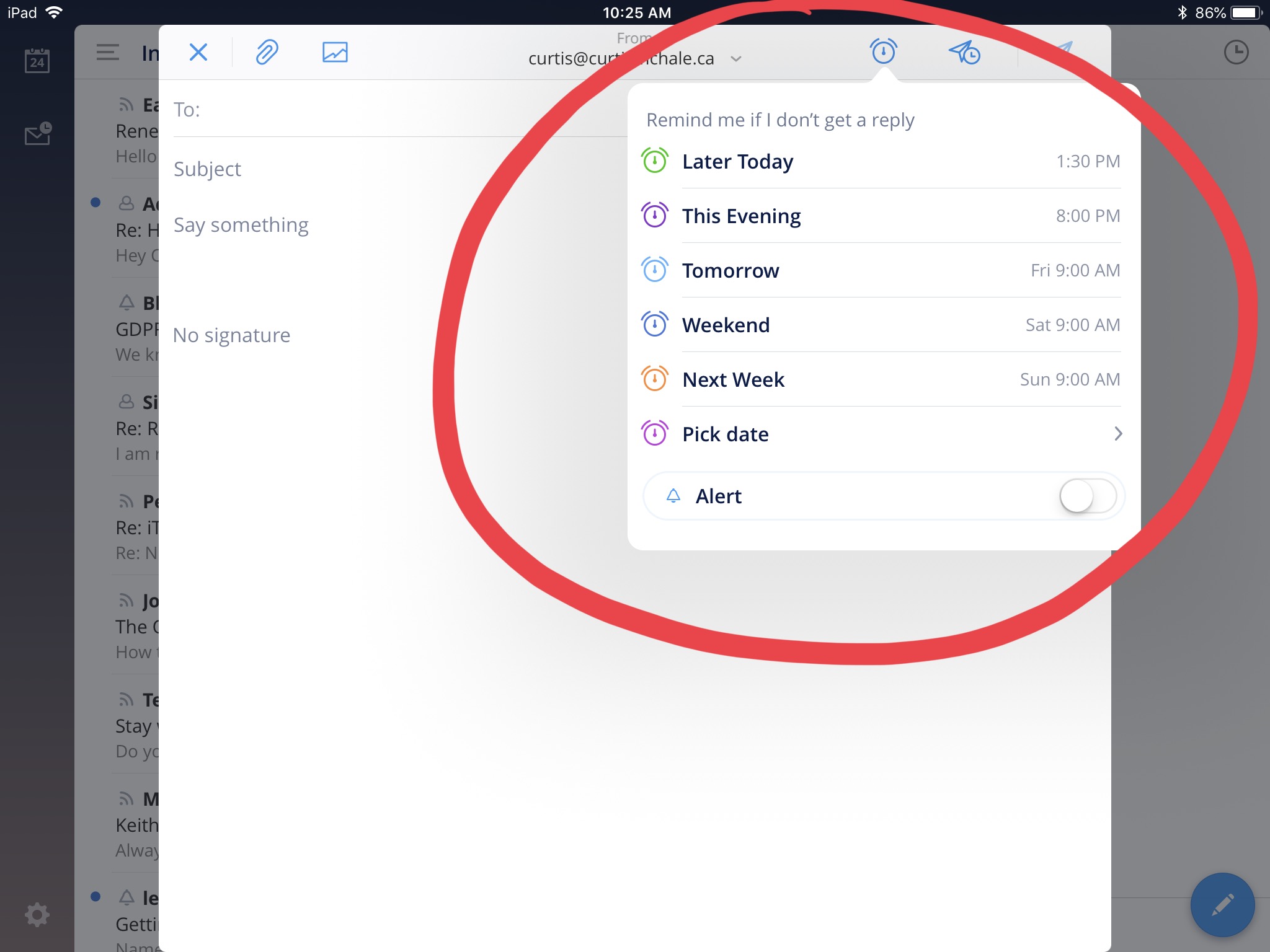 Spark has this exact feature as well and it’s as easy to use as their send later feature. Press the alarm clock in the top of the menu and set the time you want to be reminded about the email if no one responds.
