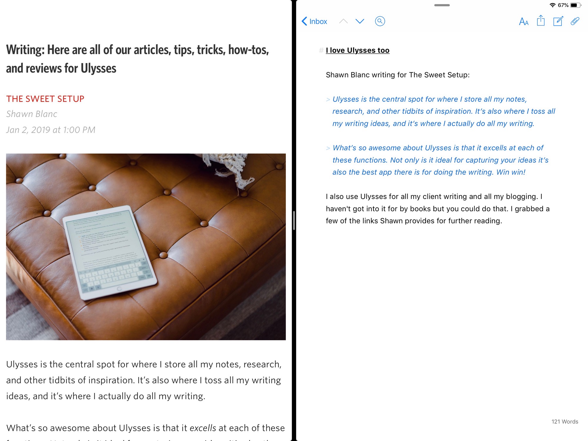 Ulysses is the central spot for where I store all my notes, research, and other tidbits of inspiration. It’s also where I toss all my writing ideas, and it’s where I actually do all my writing.