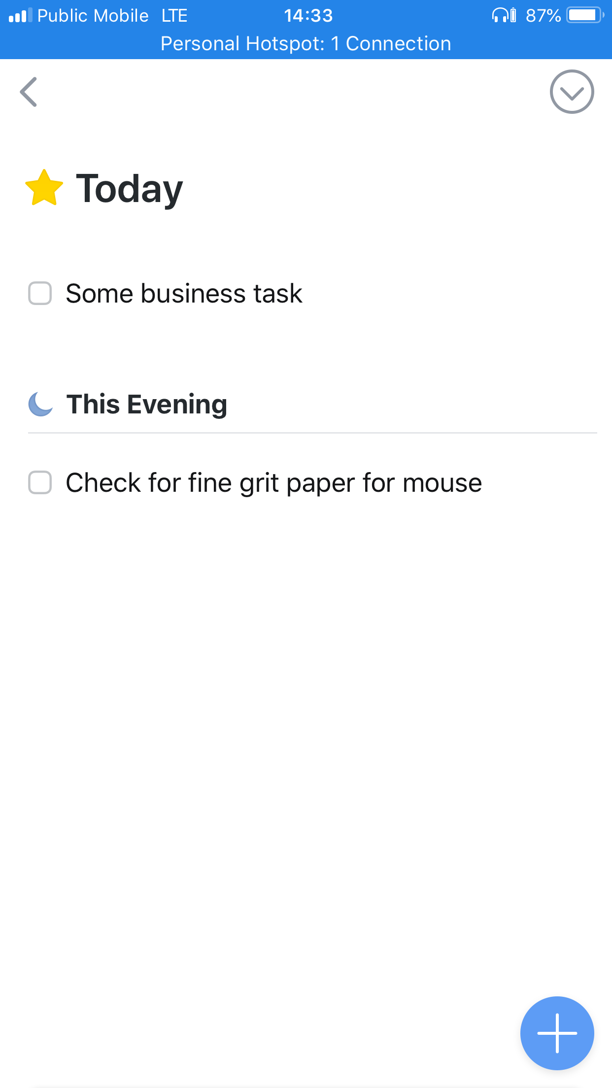 While Things 3 doesn’t allow nesting of tasks like OmniFocus does, it does allow you to add a simple checklist to a task. I’ve often used this when I'm heading to the grocery store. Going to the store is a single task, and the items I need are in the list. Unlike adding new tasks, adding an item to the list drops you directly into the next item without needing to “add” it again. That makes adding the stream of consciousness list my wife and I make together so much faster to enter.