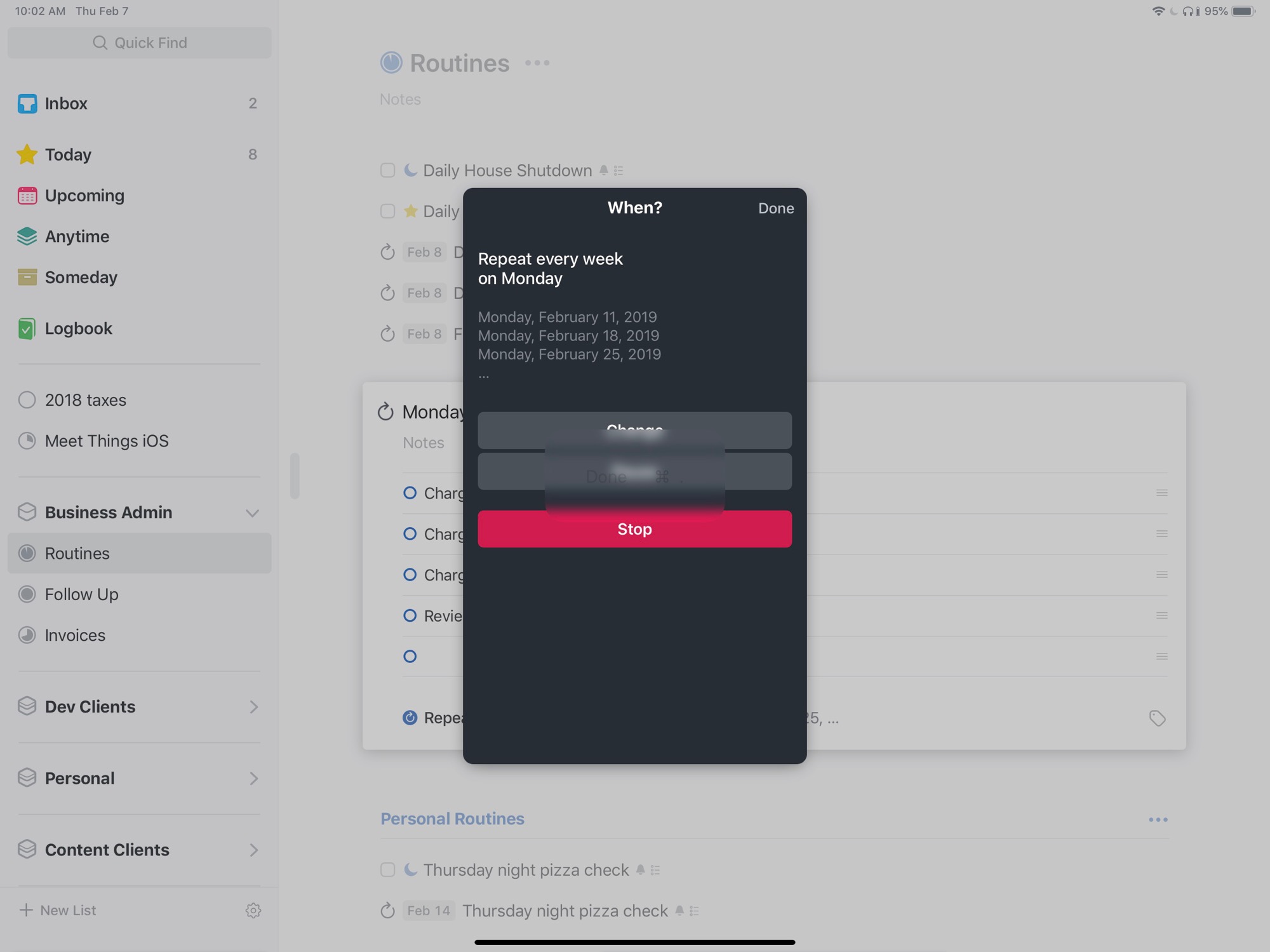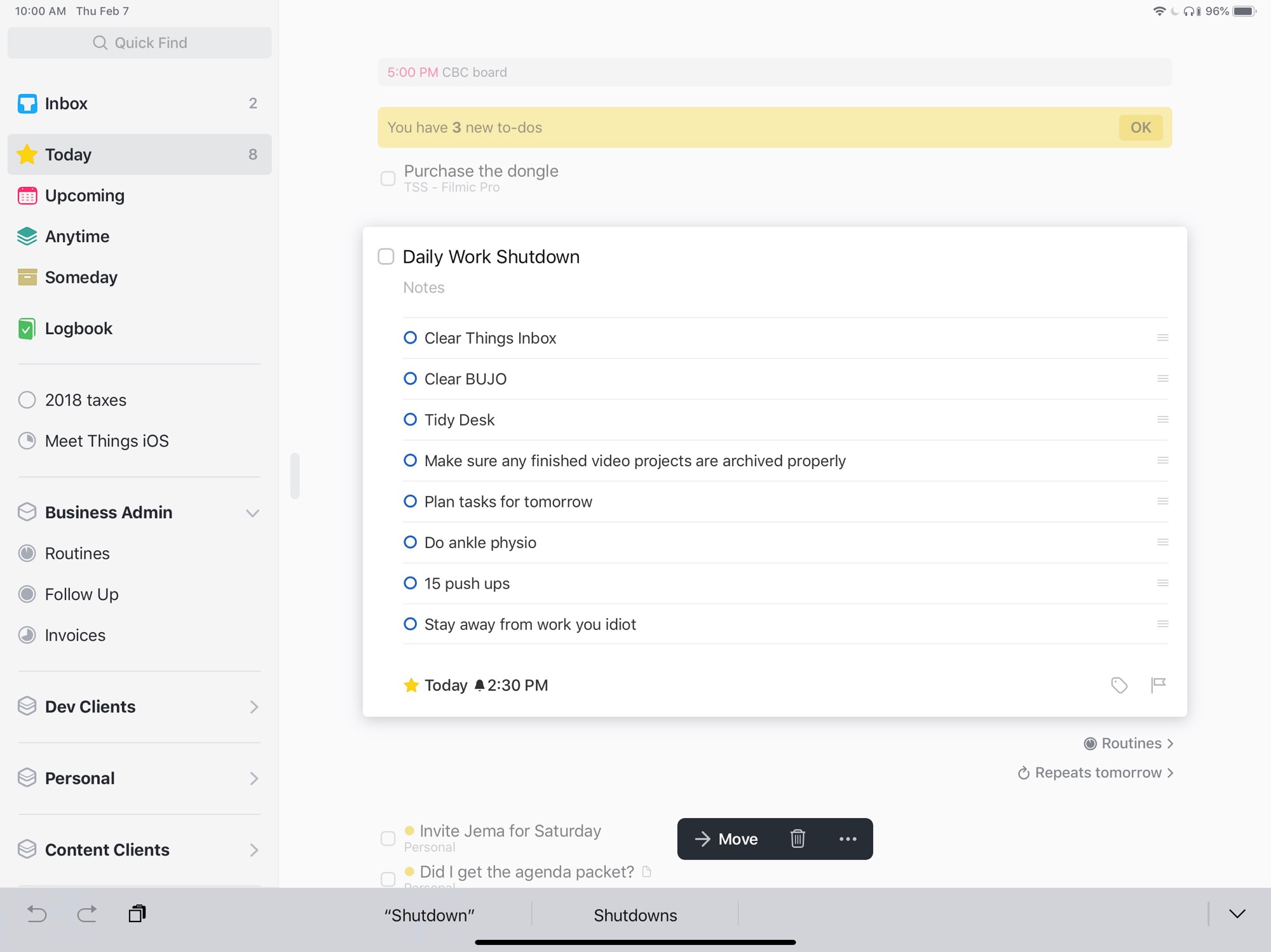 You also saw this in my video on using Things 3 to track my routines. I added the things I wanted to do to shut down my day to a checklist on a task. Then the task got a recurring reminder associated with it. I even went as far as allowing Things 3 to alert me. That meant it was the only application which was given that privilege on my iPad.