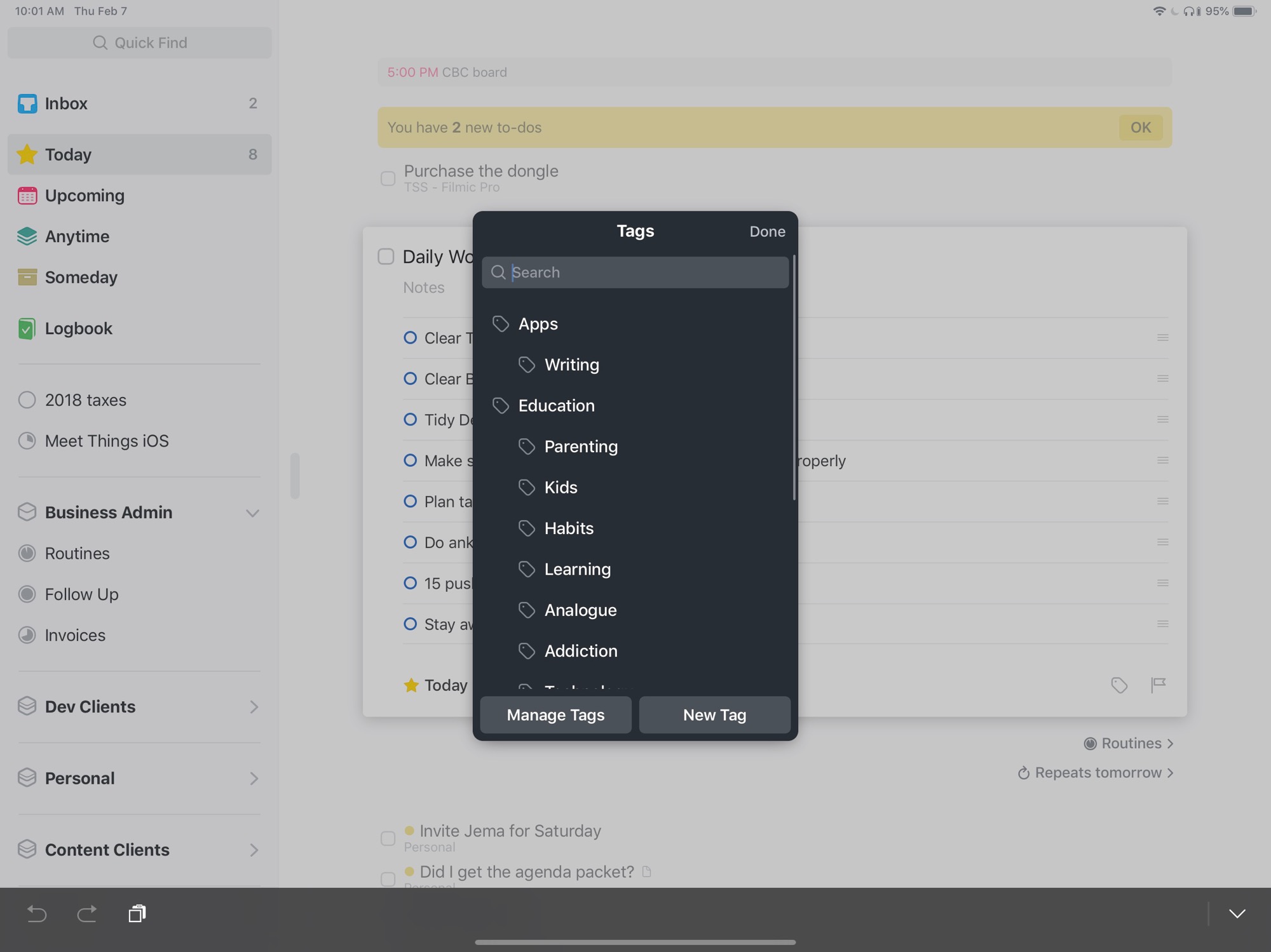 In many circles this method of breaking out your tasks has fallen by the wayside since we all carry at least one device that can do almost anything in a Context. Instead of strict Contexts, Things 3 has tags. You can put as many tags as you want on a task. You can nest tags. Tags are the future so much so that even the latest version of OmniFocus has moved to tags from Contexts.