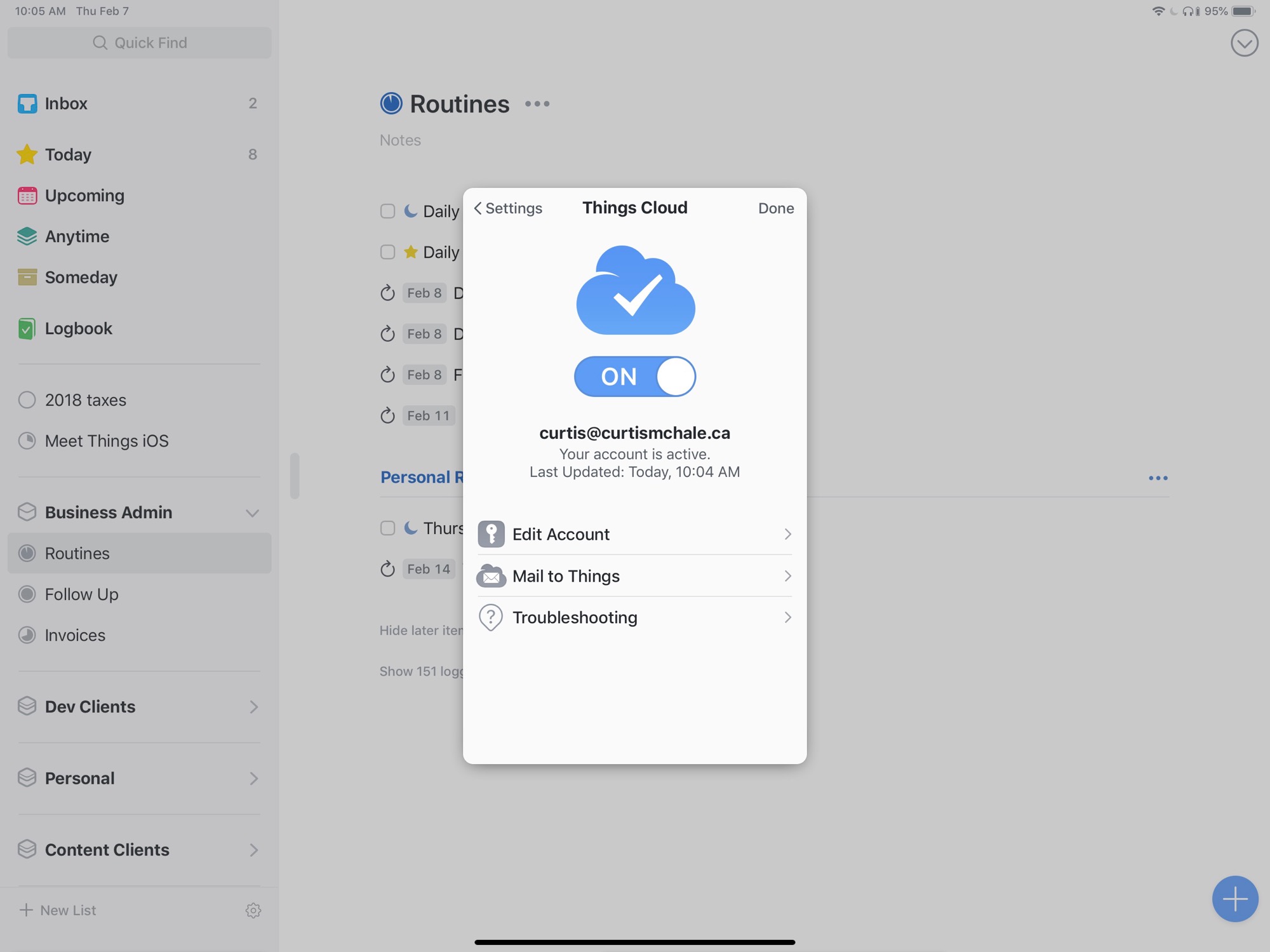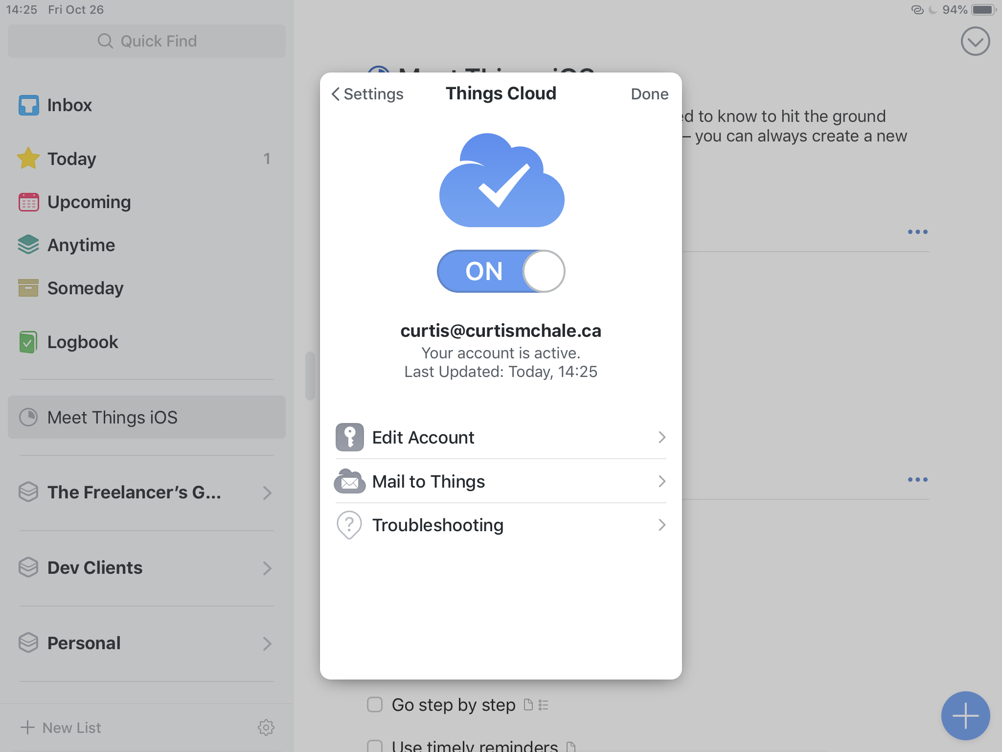 If you choose to sync your Things library with their Cloud service, which is the only way to sync...so you’re going to do it, you can also choose to turn on their Send to Things email option. This will allow you to email items into Things from anywhere.
