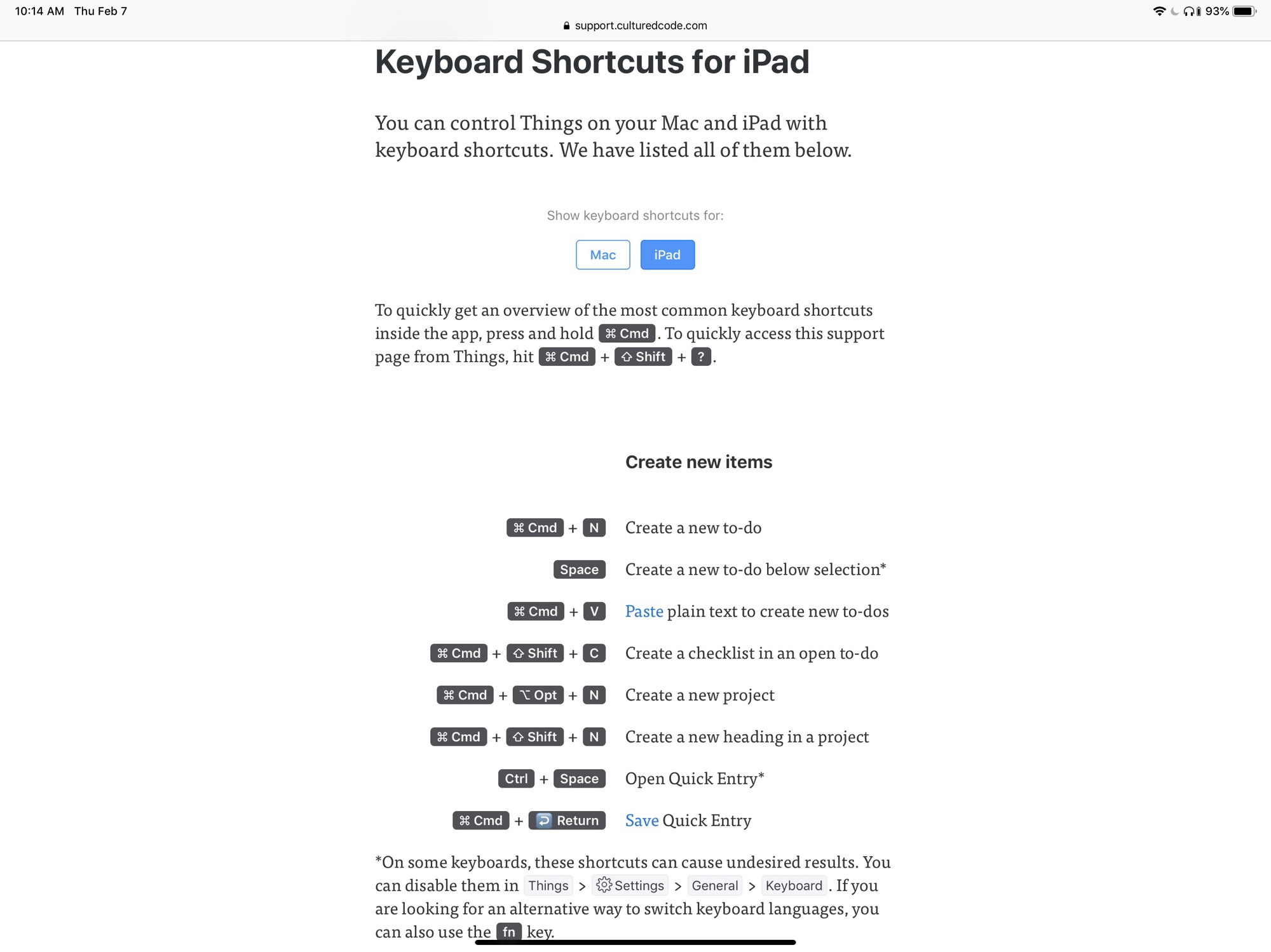 Luckily, Things 3 doesn’t suffer from this problem in any fashion. With the Things 3.6 update Things 3 brought us a full suite of keyboard shortcuts. Seriously, they have the most keyboard shortcuts of any iOS I’ve encountered so far. This makes the Vim user buried deep inside giddy to the point of throwing up rainbows.