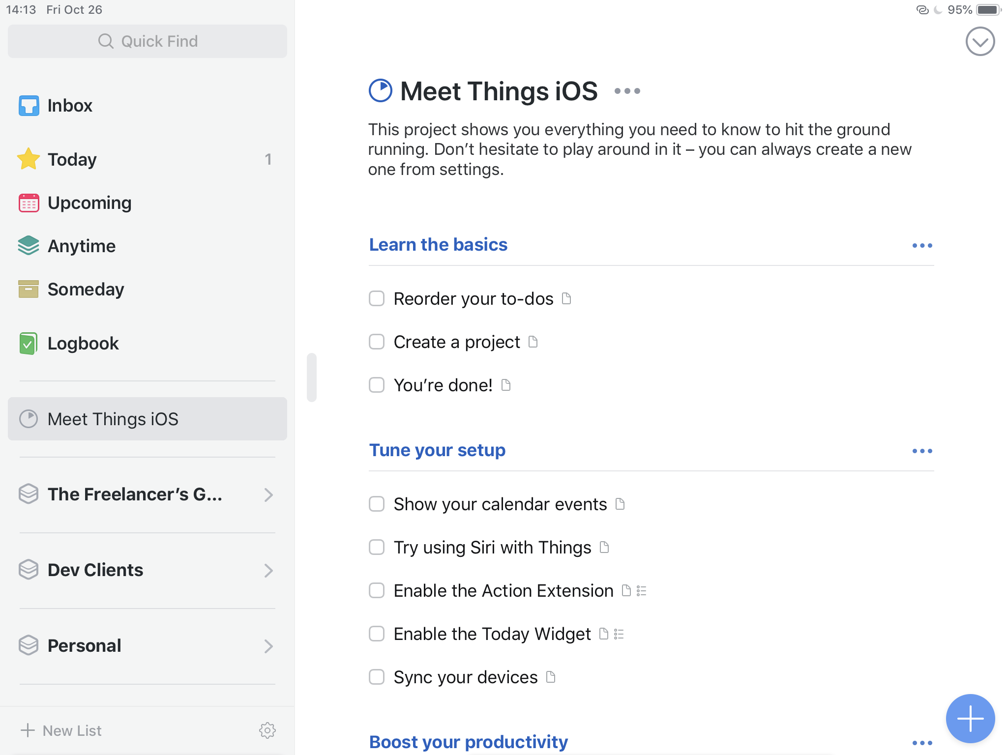 Getting started with Things 3, they have a nice task walk through in the form of a project in Things that you can step through. It does a great job of introducing you to 99% of what you’ll be doing with Things 3, without overwhelming you with that extra bit of power that’s under the hood.