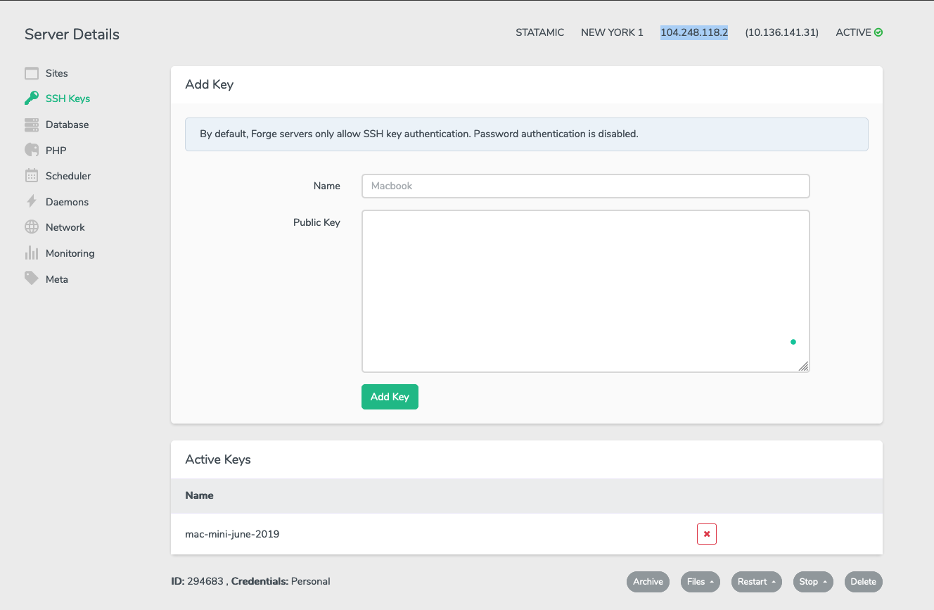 The second gotcha with the Forge deploy was that I needed to use Forge to add my SSH key to my site. You can do this easily, but it wasn’t clear to me out of the gate.