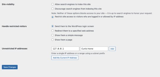 One of the things I like about using Restricted Site Access is that I can programmatically set the IP addresses that are allowed to view the site with my Github Actions deployment scripts. I use these scripts to do other things like setting the staging payment gateway so keeping everything in one spot is nice.