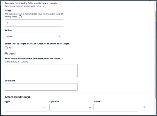 Once that is set, your site should stop being accessible to anyone. Of course, you want to be able to access it, so next, you should add a rule to allow your IP Address. To find your IP Address I use this site and you're going to want the IPv4 address because Web Rules don't currently work with IPv6 addresses.