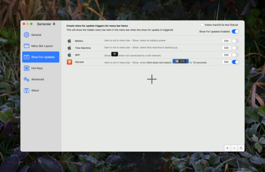 One of my favourite features of Bartender is that it lets you hide things until they update and become something you want to know about. I use this with my Harvest timer while working. It's set so that unless it matches 19 minutes it will be hidden. This means I always see it while my timer is running on client projects. I also have the WiFi icon set to show when I'm not connected to a network. That means I don't see it when I'm in my office wired, but I do see it when I'm at a coffee shop and want to connect to their internet.