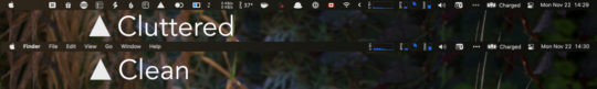 As you can see from the above 2 screenshots, without Bartender my menu bar stretches across the whole screen, and in fact, there is at least one icon that doesn't show up at all. The second image is of what I see every day with Bartender, a clean menu bar.