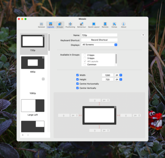 The most often used setups for me are the centered Finder window, full-screen windows for coding and writing, then split left/right windows when I need to reference two different items at the same time.