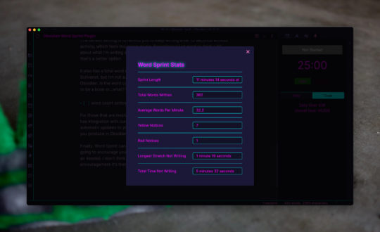 I do think that Word Sprint should be in your toolbox if you're a writer using Obsidian for your manuscript. Unfortunately, the sprint doesn't span different notes in Obsidian so if you're jumping around in your manuscript to work on sections as ideas come to you, Word Sprint won't track that work like Scrivener would.