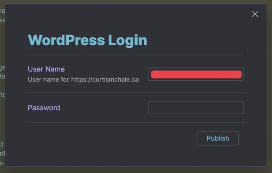 To publish click the WordPress icon in your sidebar which will reveal a panel in the sidebar with a Publish button for you to click. Once you click the Publish button a window opens up with your username prefilled and asks you to fill in your password.