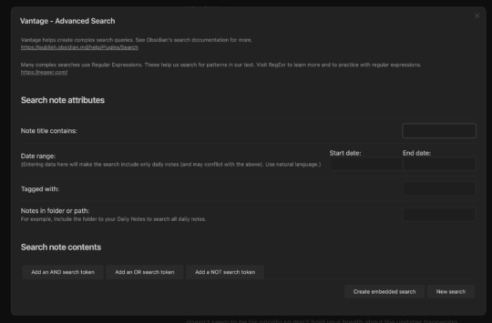 Vantage provides a user interface to build out search queries. If you're not familiar with Obsidian search syntax then make sure you check out the documentation. Instead of typing brackets and other keywords into the search field Vantage brings up a custom user interface that will allow you to add and remove pieces of a search visually. It then translates the search you've built into something Obsidian can use in its search field.