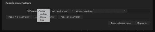 Then each of these different operators have other options under them so you can refine the context of your search. You can choose to search notes, lines, sections, or blocks. You can refine by the type of content, like lines of text or tasks. Finally, you can add parameters for email addresses in the note, or to search for notes with links to other notes.
