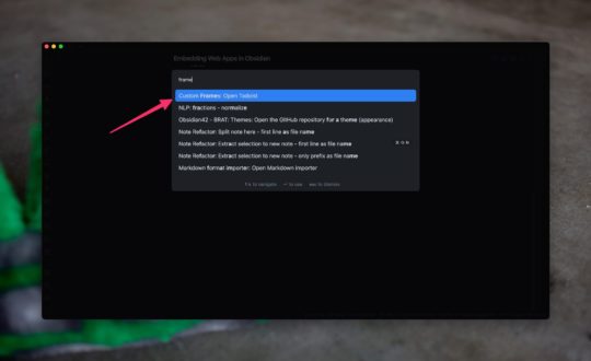Before we go any further, you'll need to restart Obsidian to get your iframe. Once that is done open the Command Pallette and type frames to bring up the command for our new iframe. This will open your iframe in the sidebar by default and give you the opportunity to sign in to your web application in the iframe.