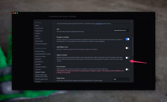 Once you select Todoist the settings screen should refresh and you will have more options to tweak how you want Todoist to work in Obsidian. The only one I really played with was the Open Center setting. This toggles where the iframe opens. By default, they'll open in the sidebar, but toggling Open Center will force your frame to open in the main working area of Obsidian.