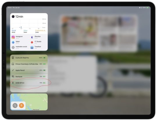 But there are some issues. First, the slim keyboard is still so tall that it obstructs the bottom of the iPad and you must be very deliberate about any swipe gestures you do. It's quite hard to swipe up from the bottom as you try to reach over the keyboard and then down far enough to perform the gesture. My thumb is too big to do it, and even with my short nails they still get in the way of the gesture.