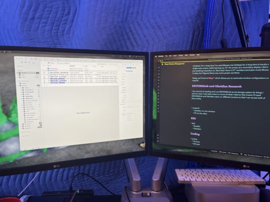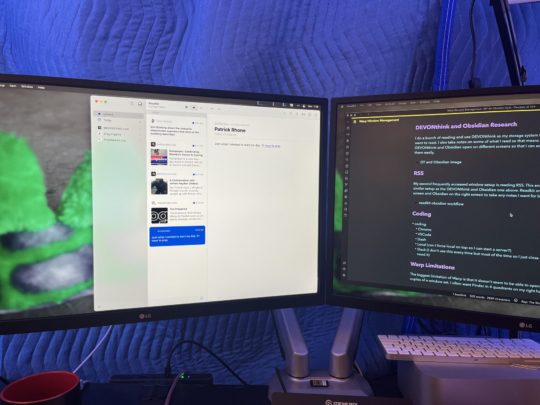 I do a bunch of reading and use DEVONthink as my storage system for things I want to read. I also take notes on some of what I read so that means I'll need DEVONthink and Obsidian open on different screens so that I can access both of them easily.