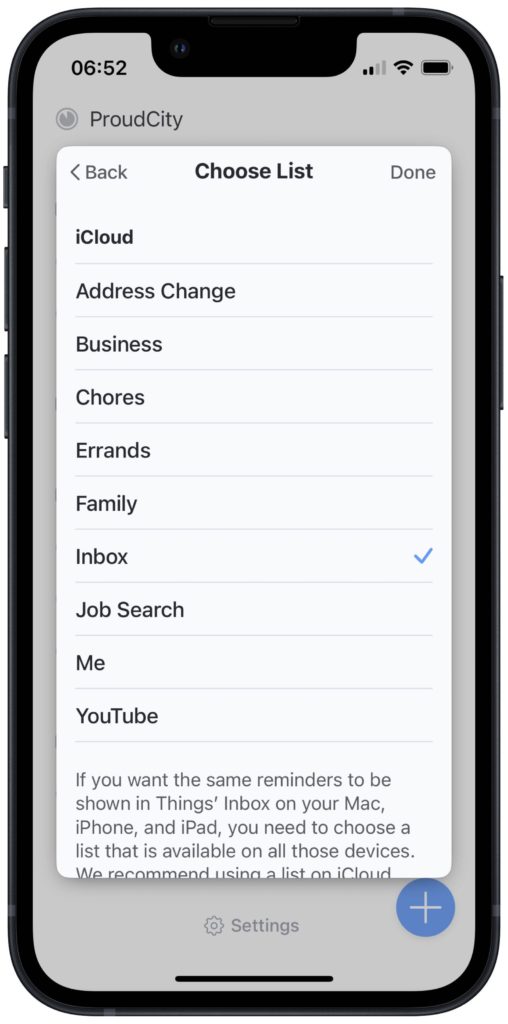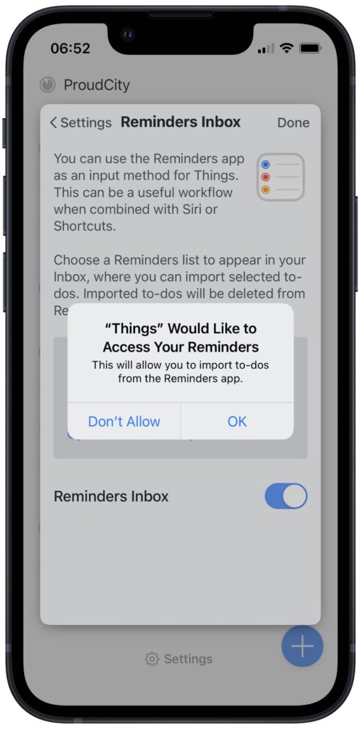 Next, toggle the Reminders Inbox setting. You'll be prompted by iOS to allow Reminders access from Things 3.