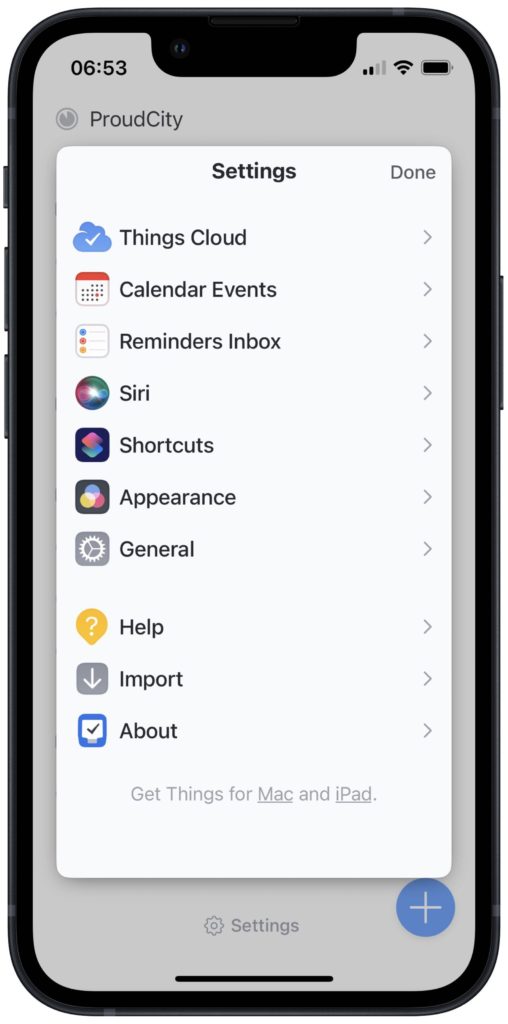One fast way to add tasks to Things 3 with your voice is via it's reminders integration. To set this up go to settings in Things 3 and choose Reminders in the top bar.