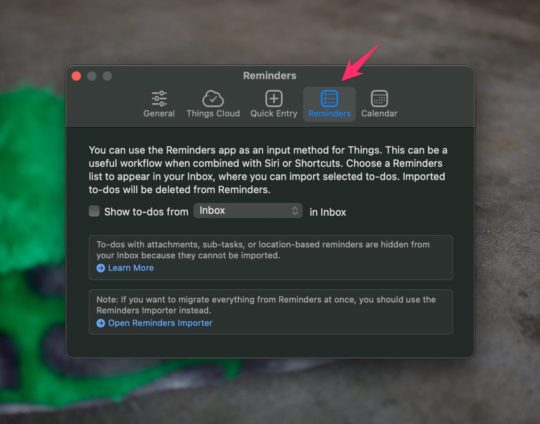 Once there select the checkbox next to Show to-dos from. Here Things will prompt you for access to Reminders. Once you've selected this you can choose what list gets imported into Things 3 from Reminders.