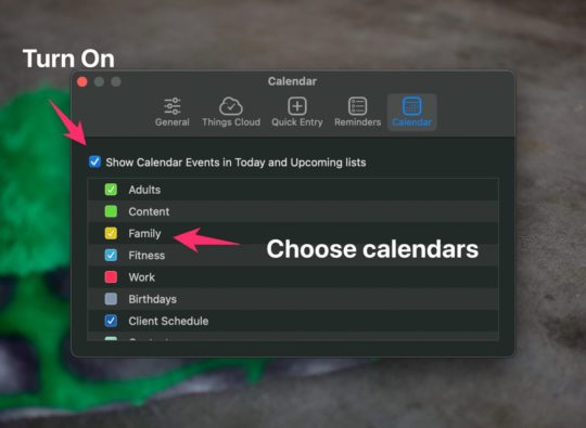To turn on the calendar integration in Things 3, got to the application settings and choosethe calendars panel from the top of the settings. Then toggle on the calendars option, and choose which calendars you want to show.