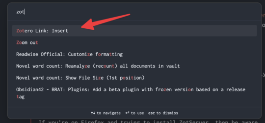 Zotero Link provides one command to Obsidian. Press ⌘ P or ctrl P to bring up the Command Palette and search Zotero. You'll see a command come up titled Zotero Link: Insert.