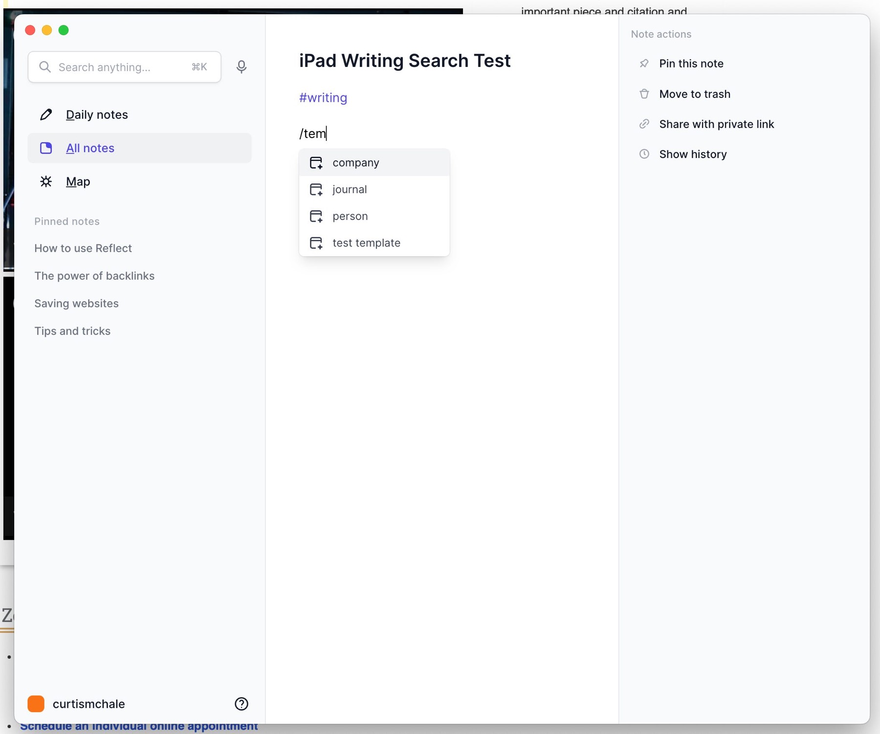 Unfortunately, if you click to browse your notes, the slide pane gets closed so you'd have to open it up again if you want to see it for reference. Even more unfortunately, if you watch the video above I couldn't figure out how to get this view to show up at all. I spent 20 minutes off-camera trying to figure it out, watching other videos on Reflect, and reading their docs. I still had no luck getting a note open in a second panel.