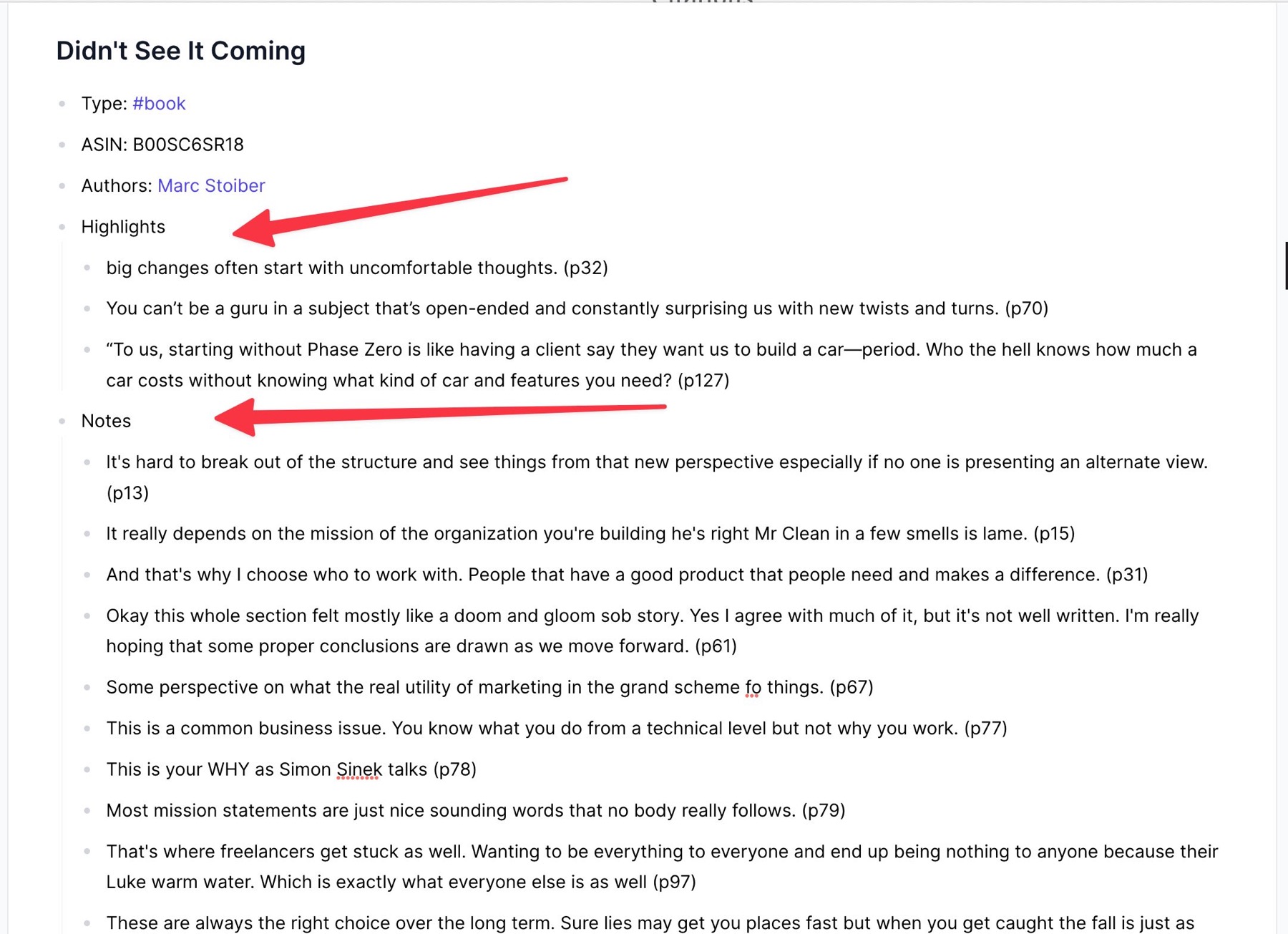 The first issue is that Reflect puts my highlights and my notes under their own bullet points. This is an issue because many times my highlights relate directly to a note that was taken at the same time. With the way Reflect organizes the notes/highlights I lose all of the context matching between the two.
