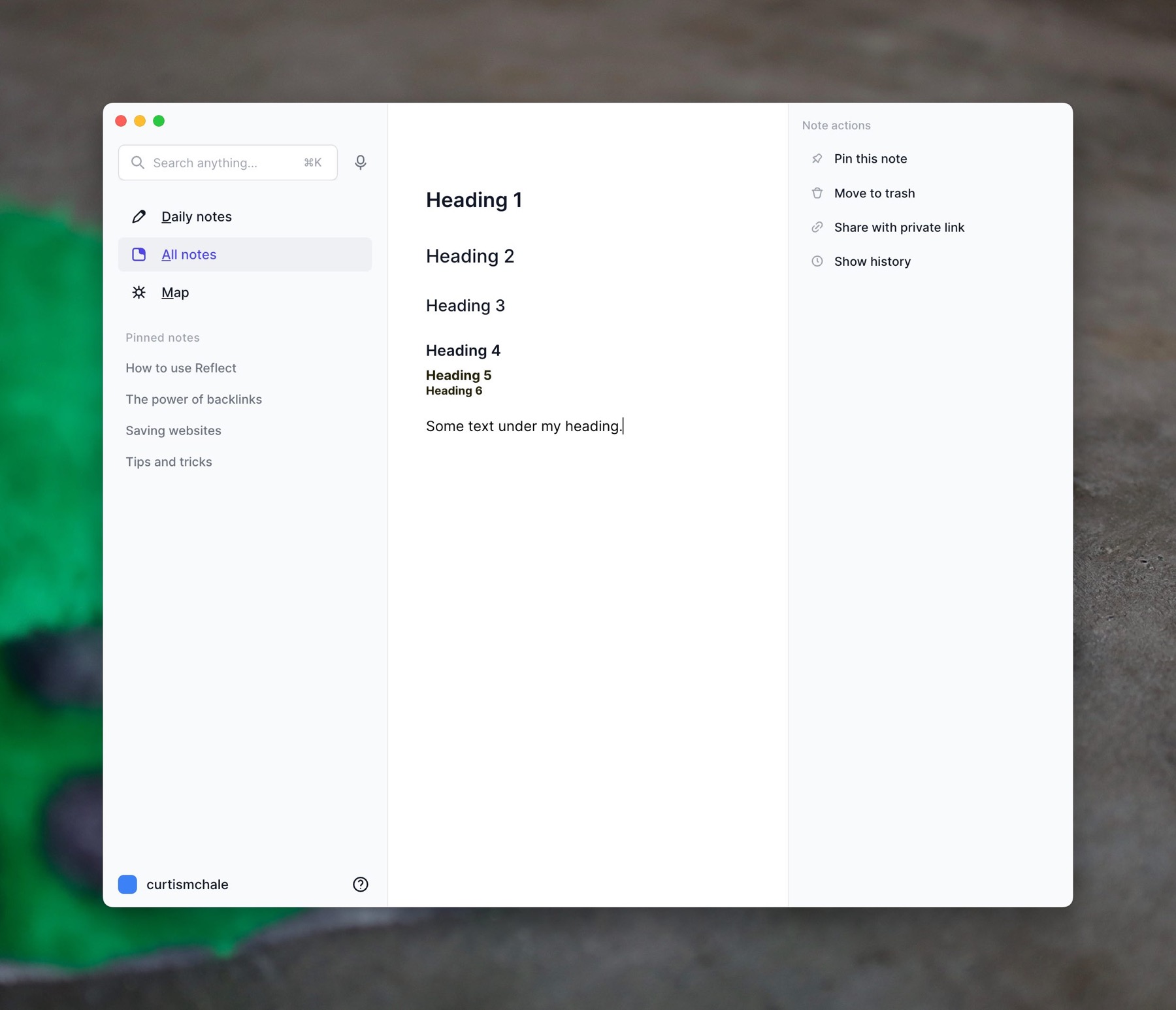 But if you wanted to change from ### to #### a fourth level heading, you can't without deleting the heading and typing the needed amount of # again. Reflect supports different styling for the full range of H1 → H6 that is standard, it just doesn't provide you an easy way to change between them from the graphical text editor that the application provides.