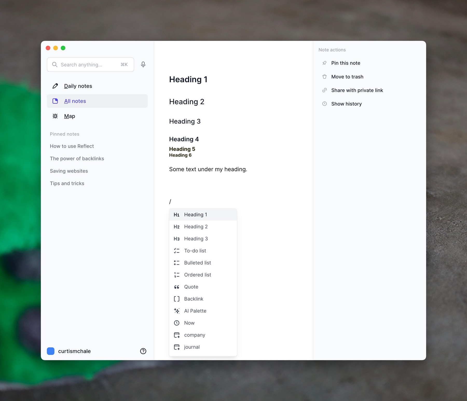 Say you add two ## to create a second-level heading. This will convert into a heading in Reflect, but then maybe you decide that it needs to be ### a third-level heading. Reflect has your back here as you can highlight your heading and change it to that third-level heading.
