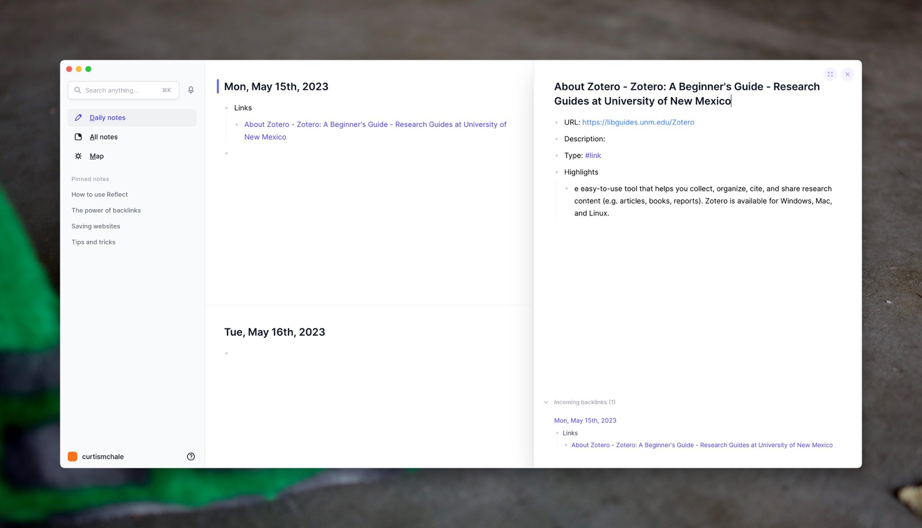 If you focus your work around daily notes and meetings, then I can see Reflect having every feature you need. It's very cool that when you enter a person Reflect will go search their information out on Twitter and other social platforms and populate it in the application for you. It's very neat that it will do this for businesses as well.