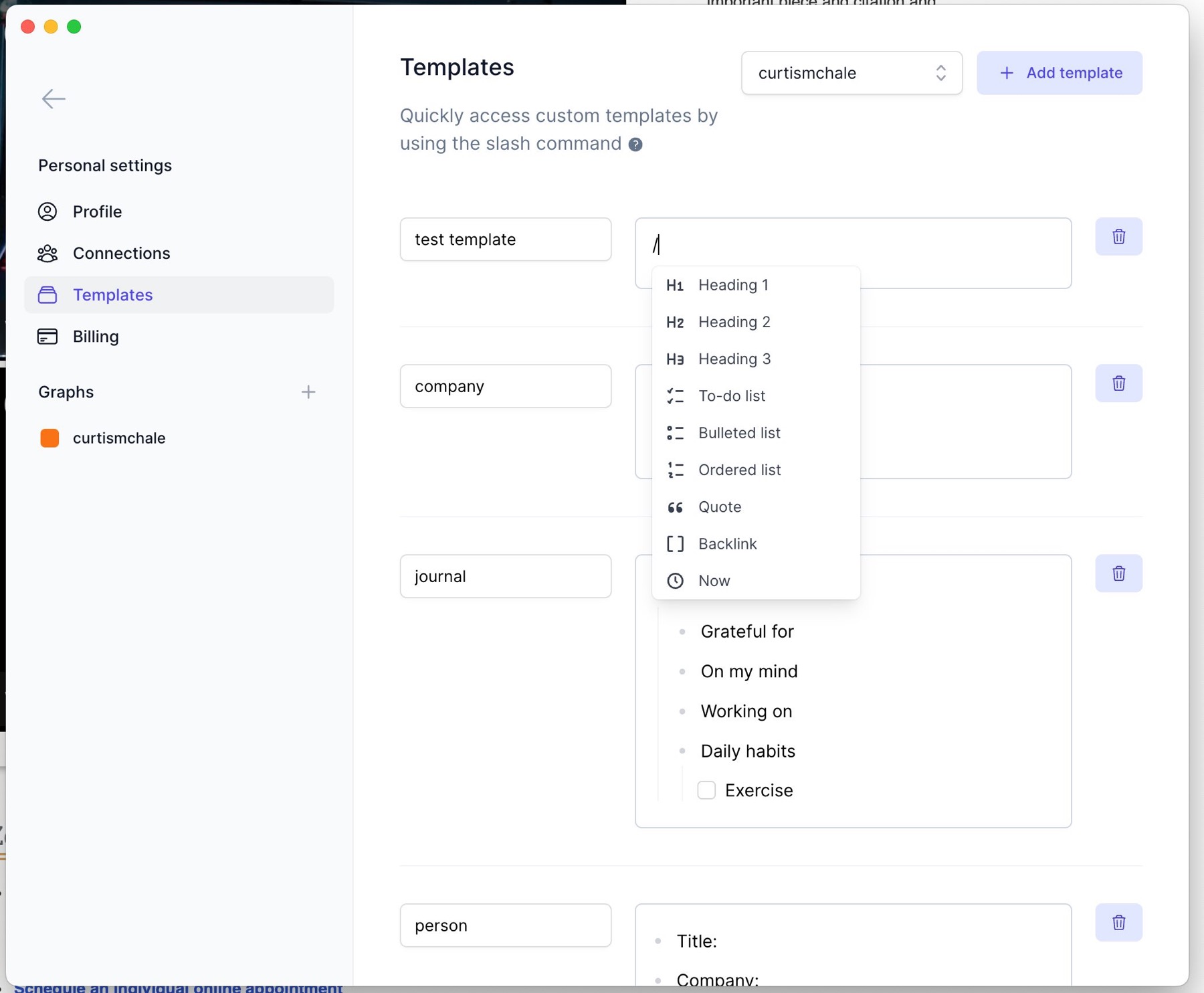 Adding template content to a note via Slash Commands in Reflect