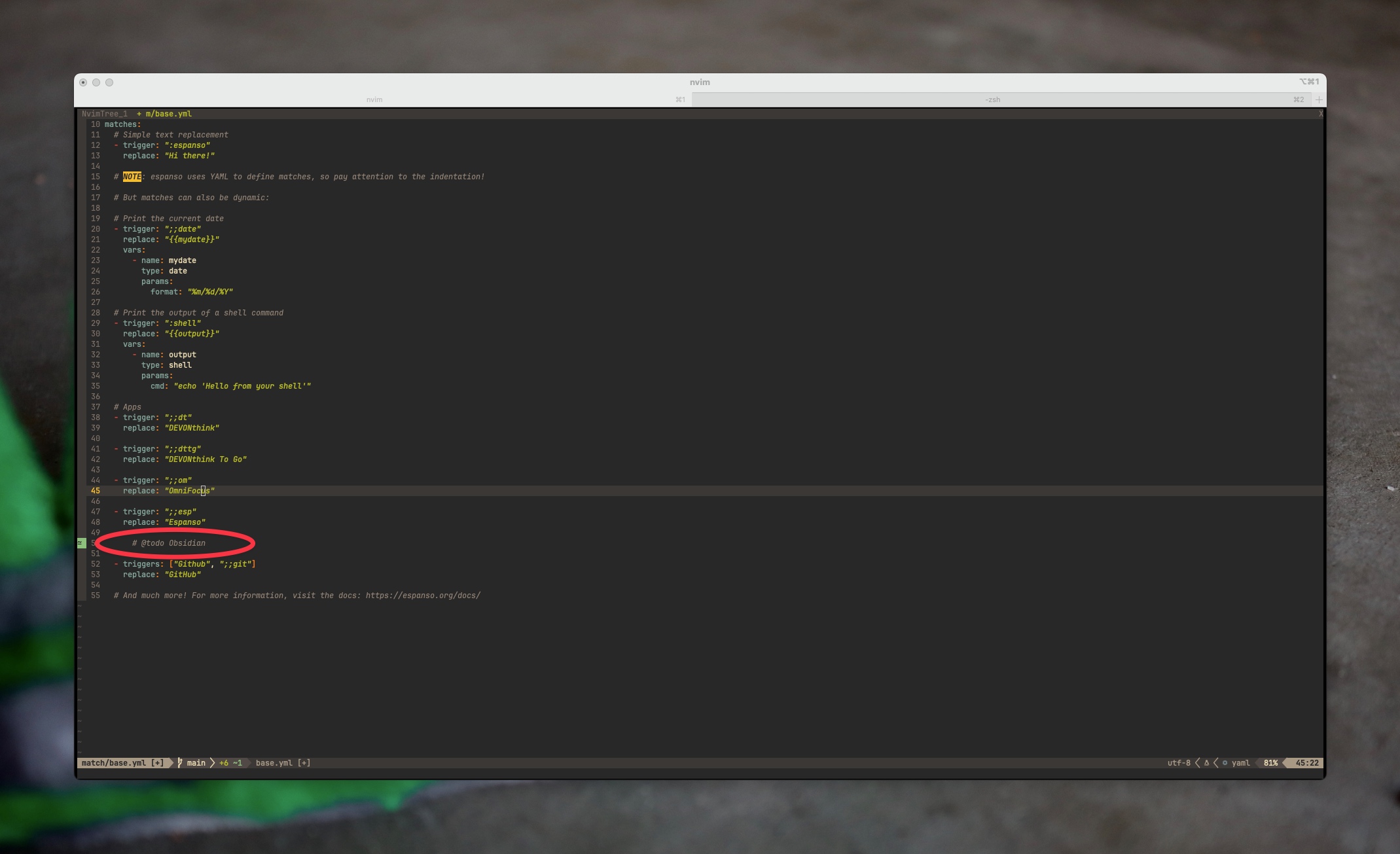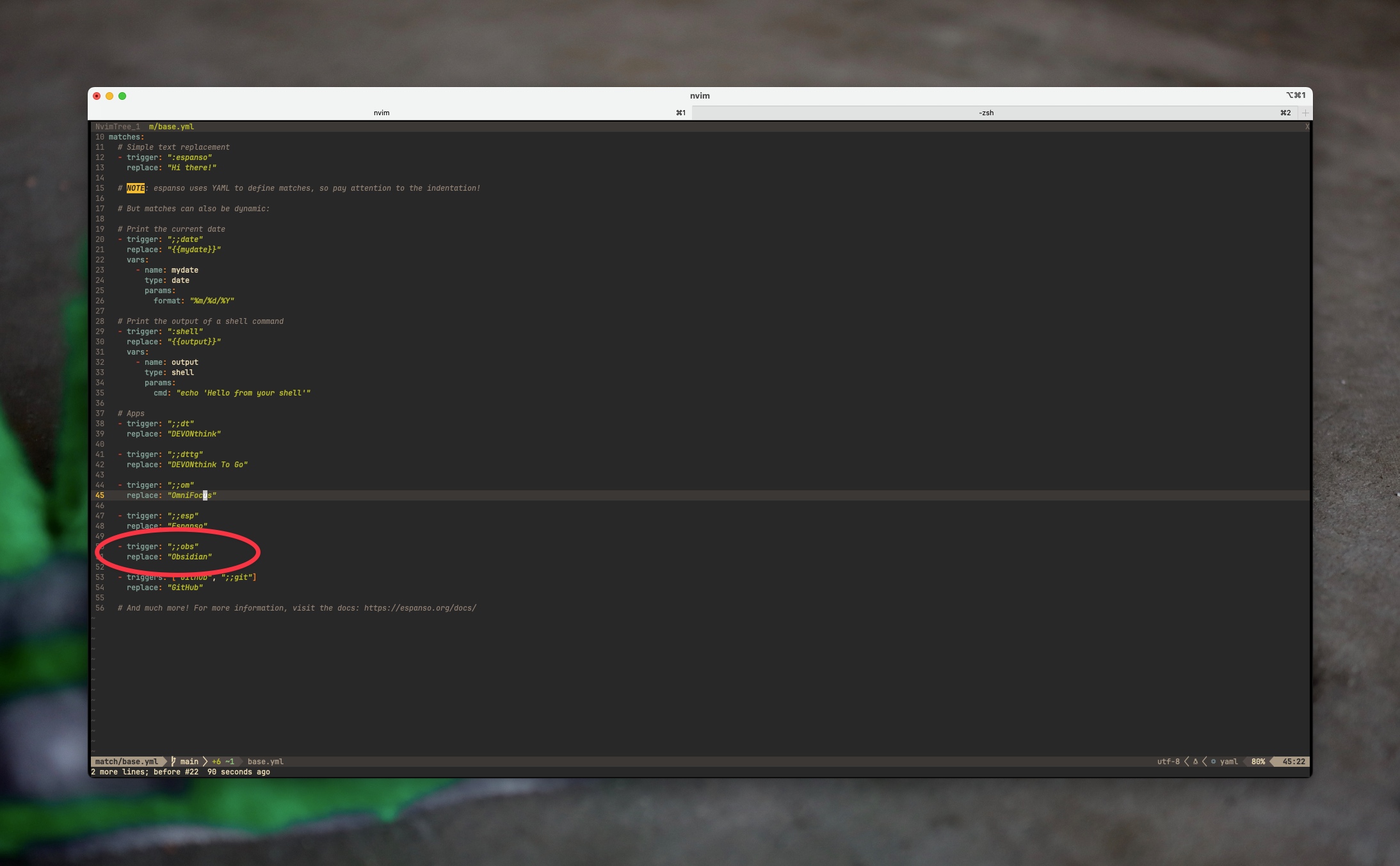 Once you find the path in the terminal you need to open up that configuration file so that you can change the snippets that are available for replacement. The configuration file uses the yml format so make sure you're using spaces in your text editor.