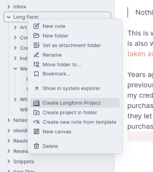 When I have an idea as described above, I start by opening up the left sidebar of Obsidian and then using the right click menu to create a new Longform Project.