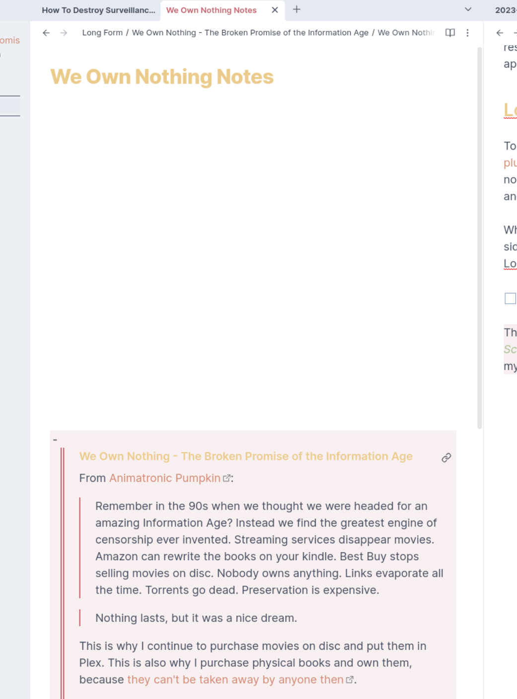 I think there is more to dig into around how we don't own much anymore, we just rent a license to display it until the company decides we shouldn't be able to display the content. From Amazon's removal of 1984, to Disney removing Willow because it's cheaper to take a write off than pay the actors, to Best Buy no longer selling DVD's.
