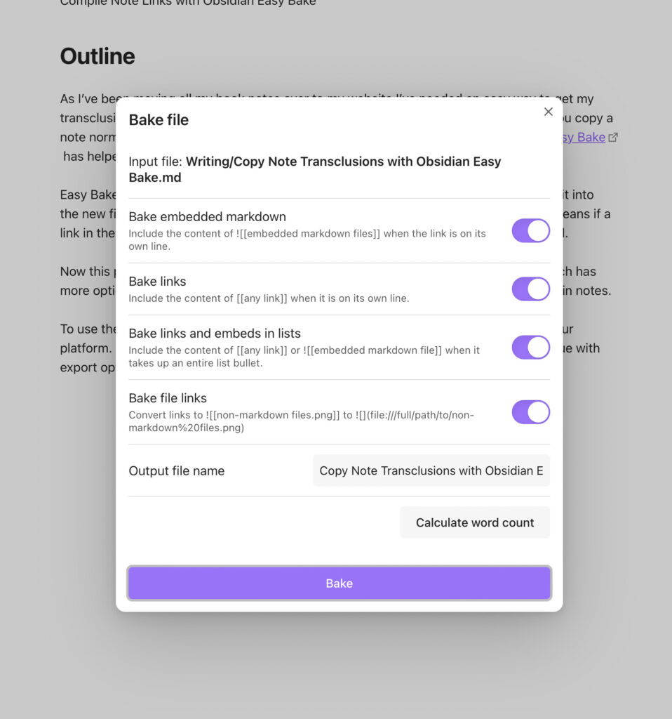 As I’ve been moving all my book notes over to my website I’ve needed an easy way to get my transclusions from my notes into plain markdown. While Obsidian shows them, when you copy a note normally you don’t get the text at the other end of a transclusion. This is where Easy Bake has helped speed up my workflow.