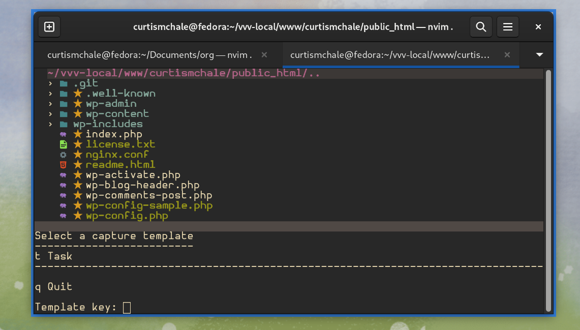 You'll note the first screenshot above offers you the option to select a template, while I didn't dig into them, you can set up custom quick capture templates that will place your note/task in different places in your org files.