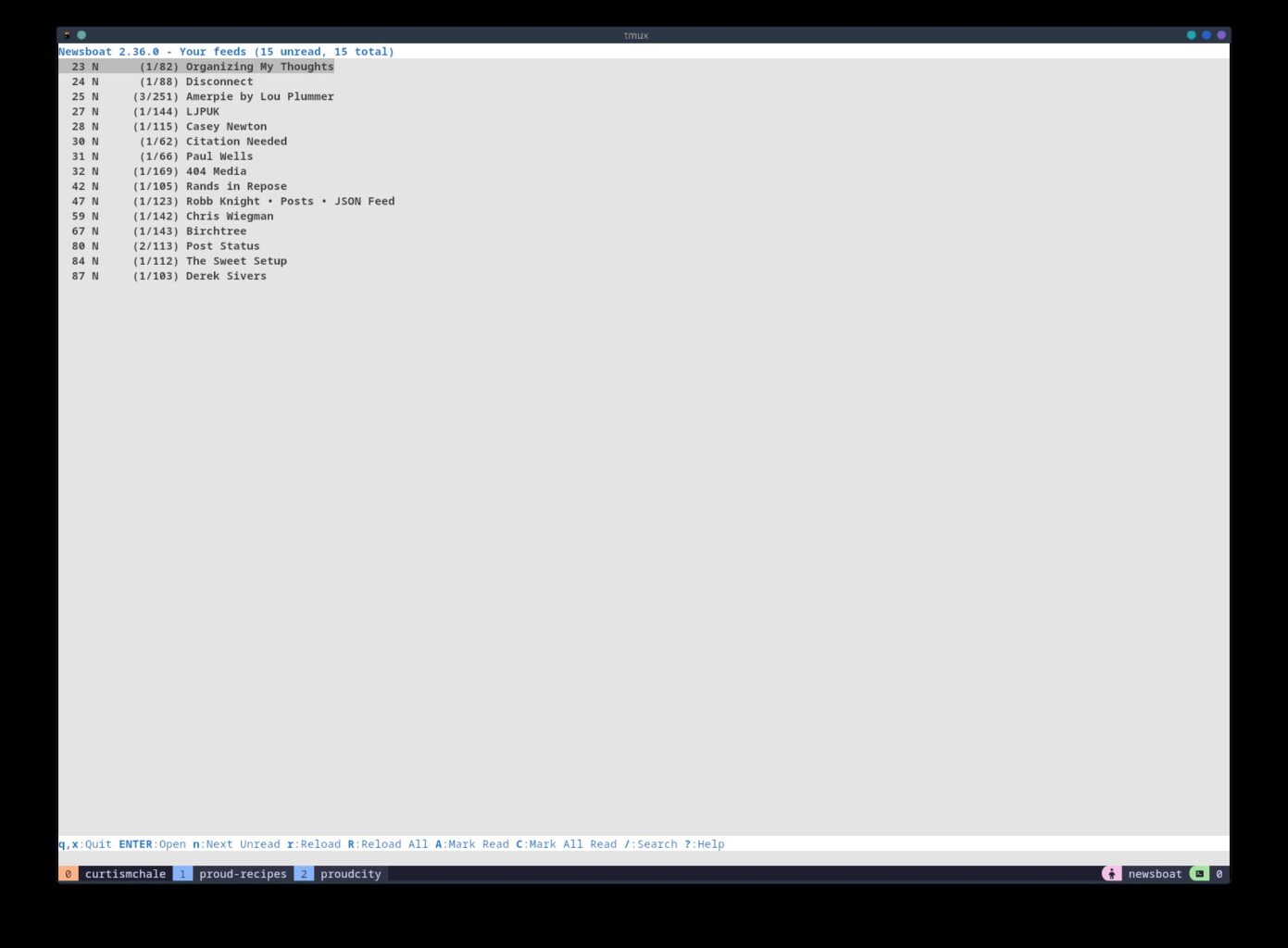 The final hurdle was the barely readable white text on black background that Newsboat comes with. Newsboat has a fairly comprehensive theme setup but it's not that obvious at the beginning. I suggest using the two links embedded in my configuration to find which elements can be changed and what each color is.